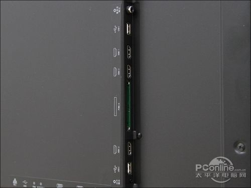 在接口设置上,三星D5000分为下置与侧置两个接口区,设置比较合理,在接口配置上拥有4组HDMI接口、2组USB接口、1组网线接口、1组PC输入接口、1组RF输入接口、1组AV及色差转换端子。最近很多电视产品都进一步缩小接口区,将模拟的色差及AV端子以转接的方式与电视相连,这也说明HDMI接口已经基本上普及实现一统江湖的局面。
