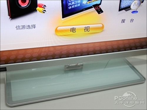 在机身底部,TCL V7300液晶电视独特加入了银色底边的玻璃底座设计,显得时尚靓丽。采用钢化玻璃的材质设计的底座,高光的表面衬托出了整款产品时尚大气风格,而且较大的底座为电视提供到稳重的摆放。