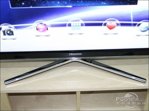 在机身正下方标有Hisense的产品LOGO,与边框反色的设计更闪亮突出。在机身底部,海信LED46XT710G3D液晶电视独特加入了银色底边的设计,显得时尚靓丽。底座是采用X形力学底座支撑起整个电视机,大大分散了机身对底座的压力,而银白色的底座与黑色机身边框的机身配合起来更突显出整体美观。