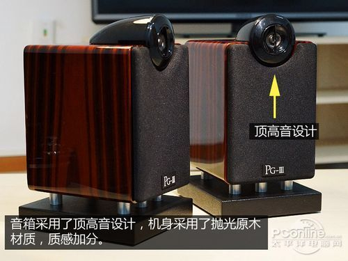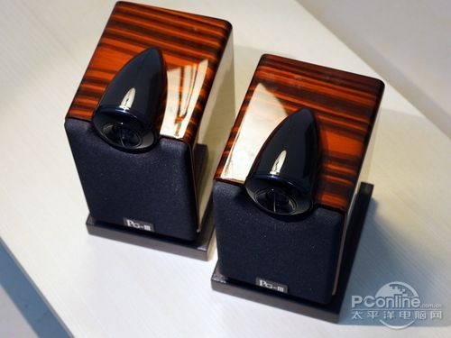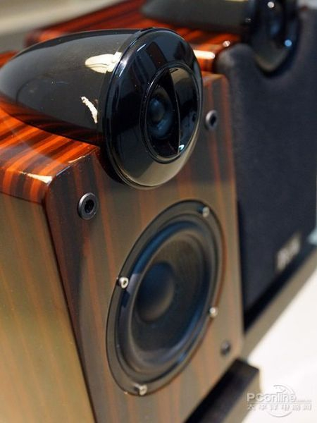 而音箱的外观则是抛光的原木材质,在外观上还是相当有质感的。而且其顶部也采用了顶高音的设计,因而在外观上也更为新奇美观,当然更为重要的是这款音箱也因而具有了更为高阶的高音表现力。
