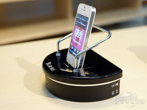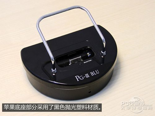 套装的苹果底座采用了黑色的抛光塑料材质,上面有一个金属的扶手,不过这一扶手还是装饰的意义更大,因为大多数iPhone或者iPod都比较薄,不会出现靠在扶手上的现象。底座上还有一个SELECTION(选择)的按键,通过按下按键可以切换蓝牙与数据接口的音频输出。