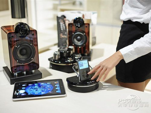 这套HIFI套装最为特别的就是单独设置了一个苹果设备底座,可以与任何采用了苹果专用数据口的设备相连。不过除此之外,这套设备还可以通过蓝牙传递音频,使用上更为简单。