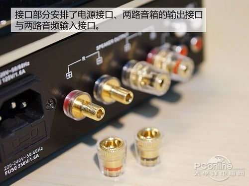 背面则设置有电源接口、两路音箱的输出接口与两路音频输入接口,这也说明这台功放不仅仅可以和苹果底座相连,像是蓝光机、DVD机等有莲花口输出的设备都可以与这台功放相连。