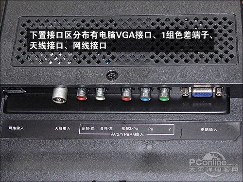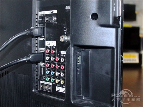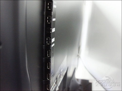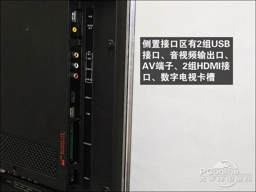 P7200的拥有侧置与下置两个接口区,这样的接口区布局更为合理。P7200拥有2组HDMI接口、1组色差端子、1组AV接口、2组USB、1个电视卡插槽与1个电脑VGA接口,其中HDMI接口数量比一般电视相比略少,不过可以满足大部分用户的使用。