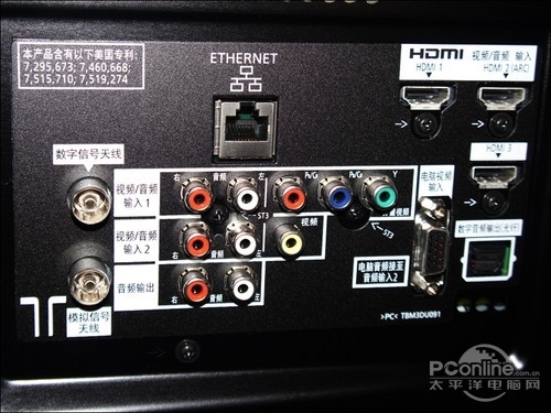 在接口设置上,三星D6000采用了与高端机器相同的侧置与下置接口区,接口拔插操作较为简便,其中配备了4组HDMI接口、3个USB接口、1个PC输入口、2组AV端子接口、1组色差端子接口与1组网线接口。接口类型丰富,位置安排合理。