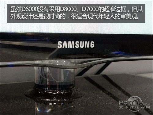 三星D6000与更为高端的D6400最为显著的差别就是没有采用超窄边框设计,黑色边框外还覆盖一层透明亚克力材质,在边缘可以明显看出这一材质,机身质感较为出色,整体外观圆滑精致。