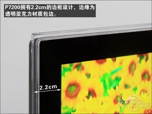 P7200的边框四周为很窄的透明边框包边,为亚克力材质,与V8200的水晶全封屏较为不同,极窄的边框显得十分灵动精巧。