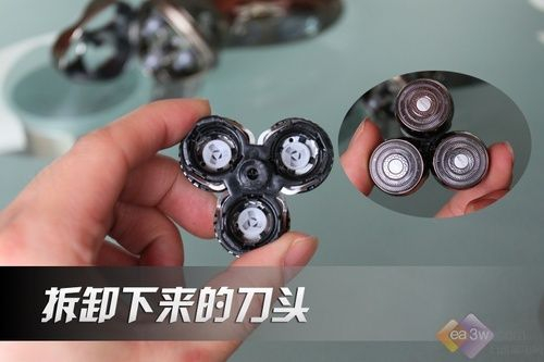 三刀头的设计中规中矩,跟传统的旋转式三刀头剃须刀一样。轻按机头前方的按钮就可以打开机头啦。浮动式的刀头,让剃须刀在剃须时更加贴面,洁面效果更好。轻按机头前侧拆卸按钮就可以打开,将刀头轻轻拆卸下来。