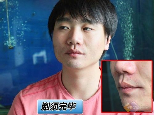 剃须过程:首先我们将剃须刀充满电,轻触开启剃须刀的开关,首先徐先生将右边的胡子刮掉,我们先来看开剃须的洁净度!从表面上看,大部分胡须都已经去除,但是在鼻子下方三角形区内仍有少量没有剃净的胡茬。经过反复的剃须,我们看到,徐先生的胡须已经非常干净了,以下是徐先生的剃须感受: