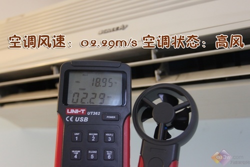在空调高风档时风速测量仪记录了其最大风速值,也就是02.29m/s,风量较小。