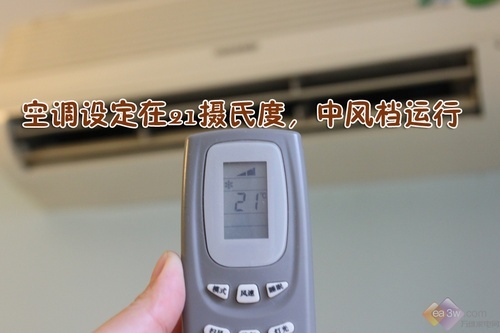 温度设定在21摄氏度,空调运转模式中风,空调开启运转。
