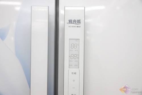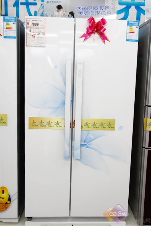 外观点评:美菱BCD-560WG属于美菱冰箱雅典娜系列的产品, 清新淡雅的蓝色百合花是这款冰箱外观的主题,很多其它冰箱也运用了花卉纹案当做机身背景,但是这款美菱冰箱的图案,简洁的白色与蓝色的优雅相互辉映,给人清新、自然的柔美感觉。着实让人感觉到温暖与舒适。