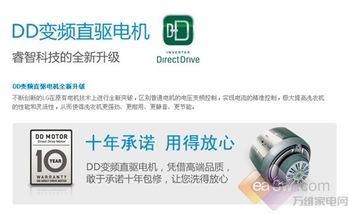 LG洗衣机采用的DD变频直驱电机,改变了传统的带传动方式,避免了由于传送带松动而引起的噪音。直驱电机不仅能效利用率高,而且静音效果也非常好。而且LG在洗衣机的售后服务方面,电机采用了10年的质保期,让消费者使用起来更加放心。