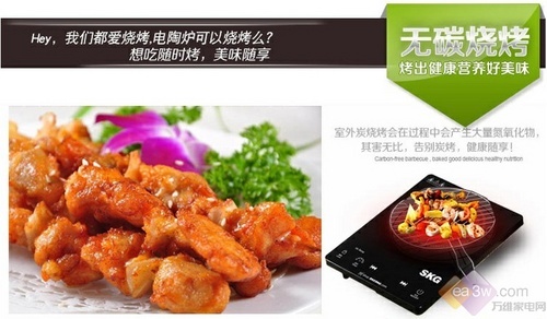 除了一般的加热烹饪用途,有些电陶炉还可以实现烧烤功能。一般的电磁炉如果想要煎炸当然要使用符合标准的锅在上边,像SKG的电陶炉则配有韩式不锈钢烤盘,可以直接放在黑晶面板上,直接享受美味。解决了炭烟大、不健康的问题,美味健康。