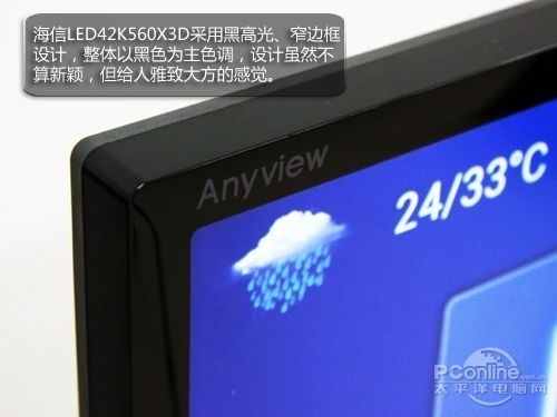 海信K560采用黑高光、窄边框设计,整体以黑色为主色调,边框底侧采用银色的铝合金金属拉丝工艺。设计虽然不算新颖,但给人雅致大方的感觉。 左边音响与待机指示灯,右边为该产品部分特色功能。白色logo在通电使用时为变亮,亮度柔和,在以黑色为主色调的设计中显得科技感十足。
