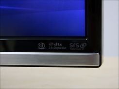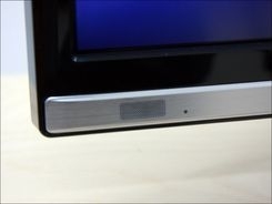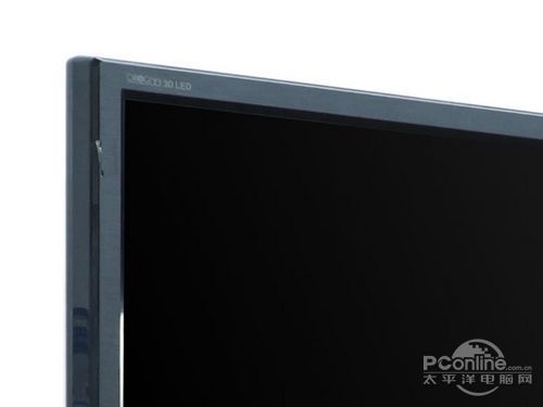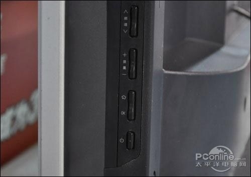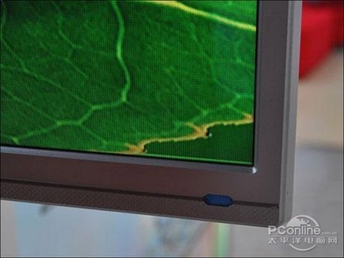 从侧面上看,即使是采用了直下式背光源,不过F3390的厚度还是控制得相当好的,不会占据太大的空间,底座采用长方形设计,整体为一块透明的水晶。而在屏幕的右下方则设置了一个蓝色的开关键,十分醒目。
