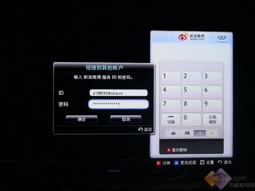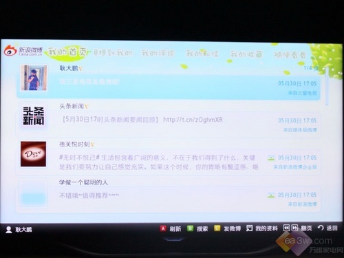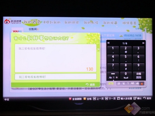 登录三星智能中心之后,与新浪微博等相关程序进行注册,就可以登录了。如果你不想关联,可以选择注销。一切完成之后,就可以通过三星 UA65ES8000J智能电视浏览和发布微博了,界面与PC版本有所不同,打字通过遥控器或者用手机下载Samsung Remote/Samsung Smart View软件进行输入和电脑一样方便。