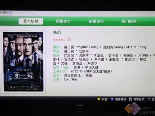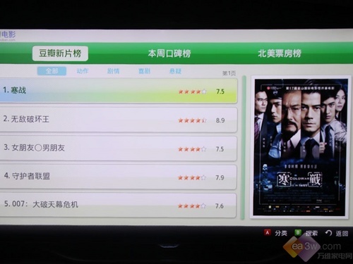 通过三星UA65ES8000J智能电视提供的豆瓣电影程序,用户可以搜索豆瓣电影中已收录的精彩影视内容,用户通过豆瓣电影可以查看影片的基本信息、剧情简介、简短评论及热门影评等四类内容。