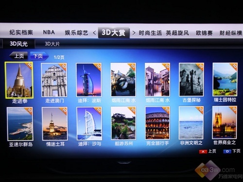 值得一提的是三星UA65ES8000J智能电视拥有的百视通平台拥有3D片源专区,里面为消费者提供了十多部高清3D片源,用户可以根据自己的喜好来进行观看,3D大赏专区的加入,在一定程度上解决了3D片源的匮乏给消费者带来的困惑。