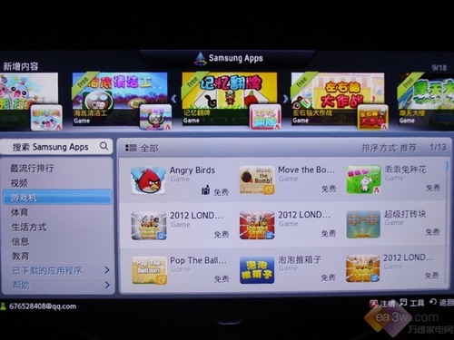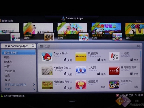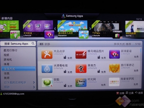 在三星UA65ES8000J智能电视的智能应用中心当中,Samsung Apps是最重要的一项功能,这是基于高清影视平台的应用程序商店,这里提供一系列付费和免费的应用程序(目前中国区域全部免费),满足用户在包括视频、 游戏机、体育、生活方式、信息和教育在内的多种需求。
