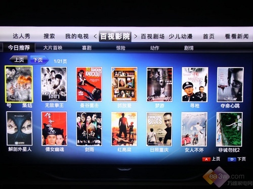 通过三星UA65ES8000J智能电视的百视通软件可以在线观看众多电影/连续剧/新闻等视频内容,分类也很详细,能够满足用户的观影需求。同时笔者还 了解到三星UA65ES8000J智能电视的在线影视内容更新速度非常快,近两个月内热播影视大片都可以在这里进行观看。