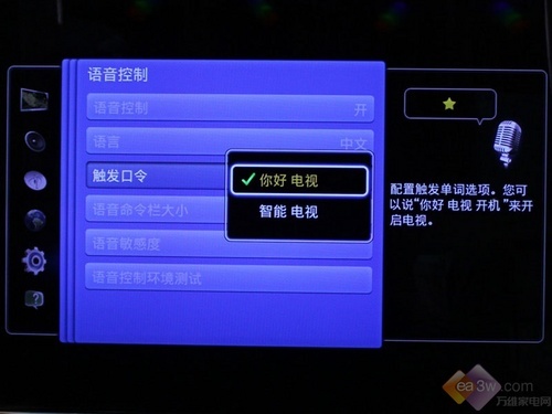 使用三星UA65ES8000J智能电视的语音控制功能每次都需要用户先说出口令,才能进行相关的操作,用户可以根据自己的喜欢来选择喜欢的开机口令。