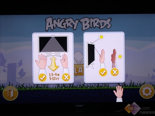 在玩愤怒小鸟之前,需要使用者先进行手势识别的调试工作,调式结束后就可以进行游戏,调式方法很简单只需将一只手对准电视机的镜头左右晃动就可以完成调 式。将愤怒的小鸟搬上智能电视这一群体化的电子设备,不仅能给用户带来更加有趣和震撼的游戏体验,最为重要的是,它将克服了个性化设备戈裂人与人之间真正 交流的弊病。