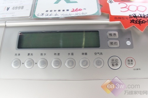 在控制面板方面,这款洗衣机采用了超大液晶显示屏以及密封式按键设计,不仅安全可靠,而且能非常清楚地了解洗涤情况。在程序方面,这款洗衣机包括了快洗程序、羊毛程序、自编程序、强洗程序等。洗涤周期可在0至4次调节,脱水时间也可在0至9分钟的时间内自行选择。
