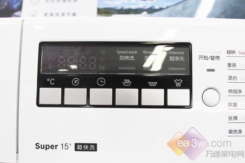 在控制面板方面,这款新乐双洗涤滚筒洗衣机采用了LCD液晶显示屏,显得十分大气,让你能够对当前的洗涤状态一目了然。功能按键和旋钮导航键都采用了电镀 处理,经久耐用。该机的洗涤程序多大16种,而其中羊毛洗、童装洗等特殊洗涤功能,也一个都没有少。15分钟的快洗功能,对于夏季的单薄衣物,是个不错的 洗涤选择。