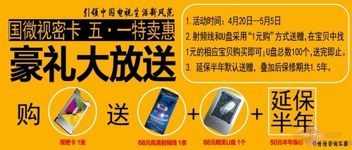 五一促销季即将来临,各家厂商纷纷整合资源,蓄势以待。引领中国电视生活新风范的国微视密卡也在五一期间与时俱进,淘宝官方旗舰店隆重开业,为消费者带来更加方便快捷的购物体验。与此同时,国微视密卡还将举行“五·一特卖会 好礼大放送”活动,4月20日-5月5日期间,购买国微视密卡,将可以以1元钱的价格购买到价值68元的高清射频线和88元精美U盘,此外延保半年也默认送赠,叠加后保修期共1.5年。
