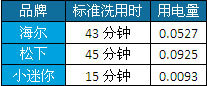 由于小迷你洗衣机还需要单独进行漂洗过程, 所以用电量看漂洗次数而定,这里只是进行了洗涤过程的用电量测试。从上面看出,在差不多相同的时间内,用电量方面依然是海尔获胜。