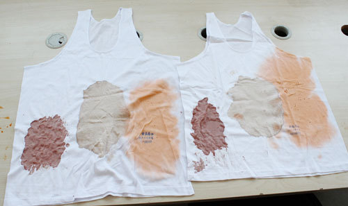 将这些污渍涂抹到新的棉质背心上面,从左到右依次为血渍、酱油渍、辣椒油渍。