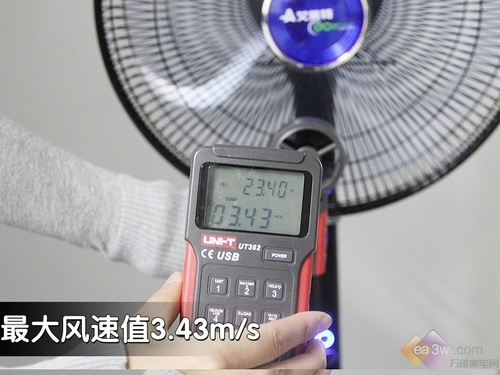 首先,我们开始本机的最大风速档位,经过实测,本机最大风速为3.43m/s,最小风速为1.18m/s,相比之下还是不错的。