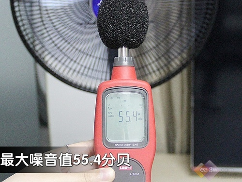 3.噪音测试,经过小编实测(本测试并非绝对安静环境),本机的最大噪音值为55.4分贝,最小噪音值为34.2分本,最小风速时几乎与环境噪音一致,听不到风扇的声音,相比之下还是比较安静的。