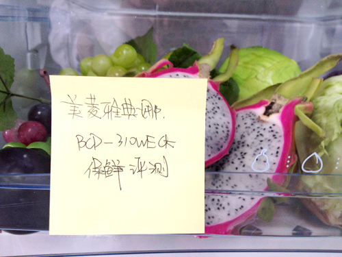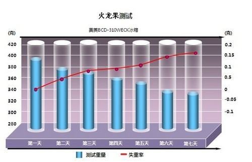 这款美菱雅典娜BCD-310WECK冰箱在火龙果的测试过程中,水分失重率还比较好。通过我们用切开法进行破坏性测试,虽然表面色泽上有些变化,但是水分失重率减少缓慢,保鲜效果还是比较不错的。