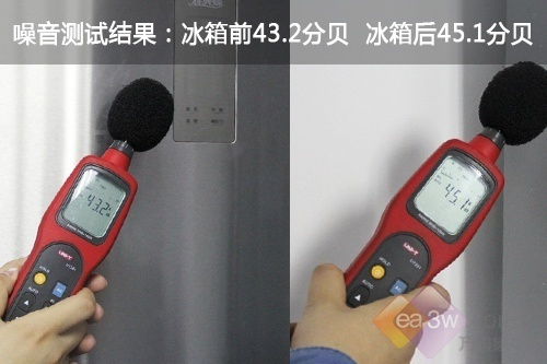 噪音方面,我们的数据取噪音的最大值,在通常的环境中,测试的噪音值也要达到30多分贝。所以这款美菱雅典娜冰箱噪音测试低于国家标准,压缩机运行稳定,并没有产生异常启动声音。