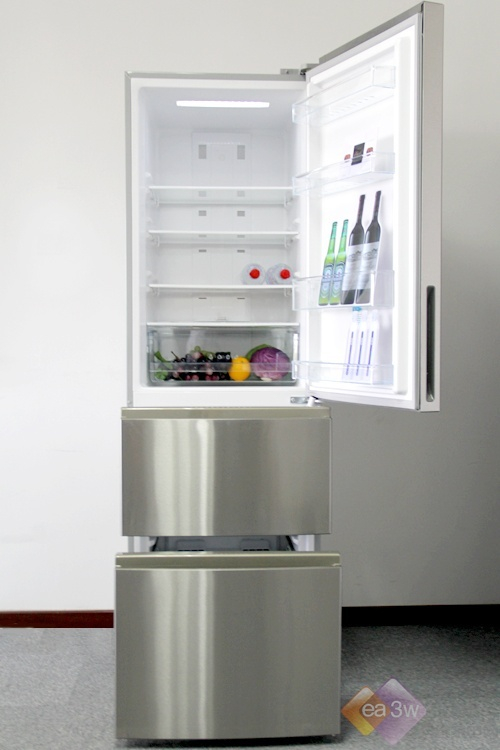 冰箱的整体采用了意式冰箱的结构设计,抽拉式的冷冻抽屉取代了开关门式的冷冻门,拿取食物更加方便自如,冷冻抽屉也不会因为长时间使用,出现冻裂损坏现象发生。