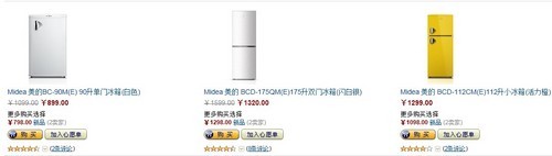 相比其它电商,亚马逊销售的美的冰箱却非常少,部分机型出现断货现象。其中主推的几款美的冰箱机型有美的BCD-185QM冰箱、美的BCD-175QM(E)冰箱等。