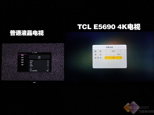 为了能让网友最为直观的感受到TCL云晰E5690超高清电视与普通全高清电视的不同,小编拿一部普通液晶电视进行对比。在进行对比之前,小编将两部电视的图像设置调整到相同。