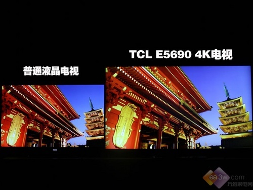 从第二幅静态对比画面的播放效果我们可以看到,TCL云晰E5690超高清电视对于屋檐、塔楼牌匾所呈现的效果远远要好于普通全高清电视。
