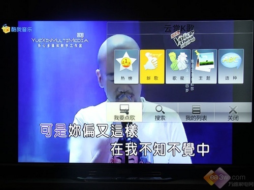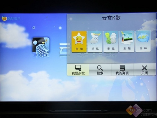 TCL云赏K歌功能是与酷我音乐深度合作推出的一款应用。点击进入TCL云赏K歌功能,我们首先看到的是非常简洁的菜单界面,共分为热歌、新歌、歌星、主 题、语种等五大选项,用户可以根据自己的平时的操控习来进行相关的操作。值得一提的是这个界面和KTV里面的点歌系统相比,更加的注重人性化操作,并无过 多的繁琐选项。