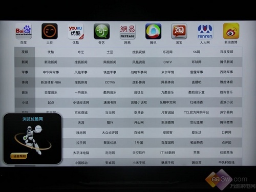 笔者在测试TCL云晰E5690 4K智能云电视全网浏览器的过程中输入了万维家电网、京东等网页都可以轻松浏览,并且速度非常的快。并且,TCL云晰E5690 4K智能云电视还可以浏览优酷、土豆、奇艺等这些主流视频网站,并支持影片的在线播放。