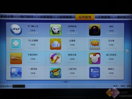 在应用管理板块,我们可以看到在TCL云晰E5690 4K智能云电视已经安装的所有软件。在这个界面用户可以对于已经下载和安装的应用程序,进行升级、卸载等相关操作。