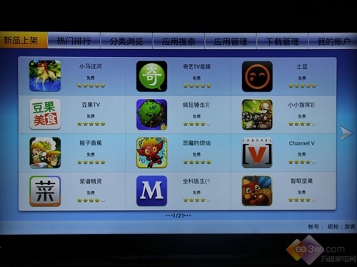 TCL云晰E5690 4K智能云电视新品上架”板块是按照应用上架时间进行排序的,每页拥有12个智能应用,目前提供了21页的应用内容。