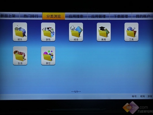 为了方便用户选择自己喜欢的应用内容,TCL云晰E5690 4K智能云电视还对应用内容进行了分类共包含娱乐、游戏、阅读、教育、工具、生活及其它七大类。