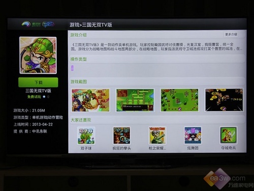 使用者选择一款自己喜欢的游戏只需通过遥控器上的OK按键便可进入其相关的介绍界面,点击界面中的下载选项,便可将游戏下载到电视中。