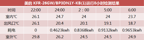 美的 KFR-26GW/BP3DN1Y-KB(1)运行8小时温度、耗电测试结果汇总: