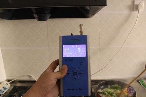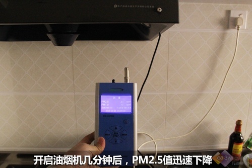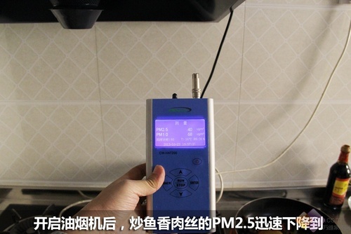 另外笔者也做了一组测试,就是只开窗不开油烟机,厨房的PM2.5含量20分钟左右后即可恢复到国家规定的安全值。而在烹饪时开启油烟机,能够较快的减少厨房中PM2.5的含量,其最终含量值与油烟机的性能有很大关系。