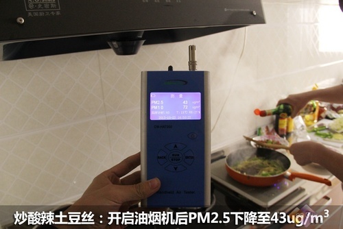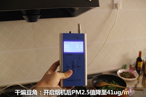 开启烟机5分钟后,干煸豆角时厨房的PM2.5含量值迅速降低值41ug/m3。