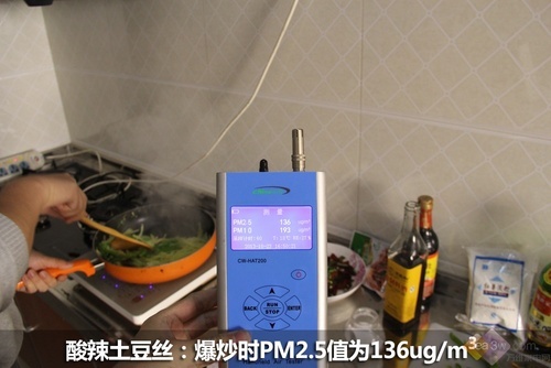 本以为做酸辣土豆丝时厨房的PM2.5值会最低,其实并不是,测得其PM2.5含量为136ug/m3。